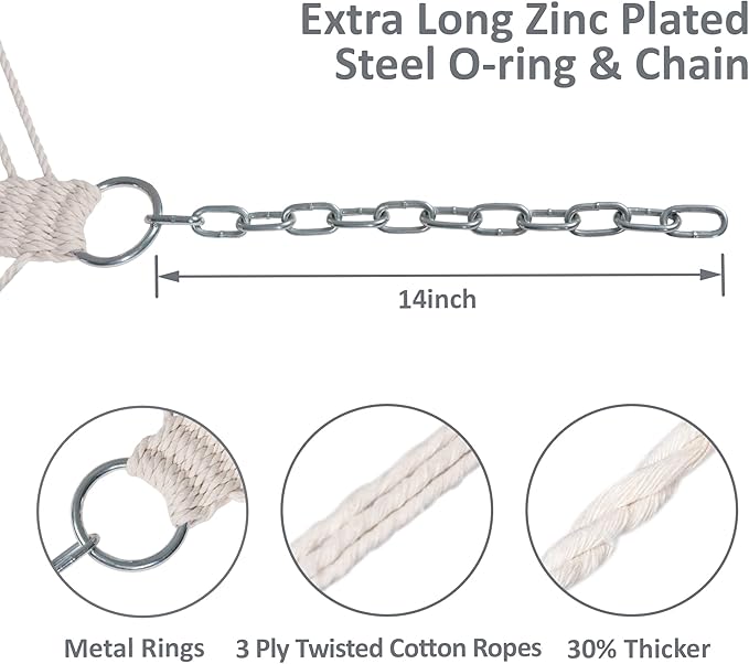 - Upgraded 30% Thicker Ropes: The upgraded strong poly-cotton ropes are hand-woven with comfortable, long-lasting threads woven by the hammock artisans, 30% thicker than before. The 20 ropes are collected together and woven into a triangle pattern which is pleasing to the eye. O-shaped steel ring attaches the ropes and the chain