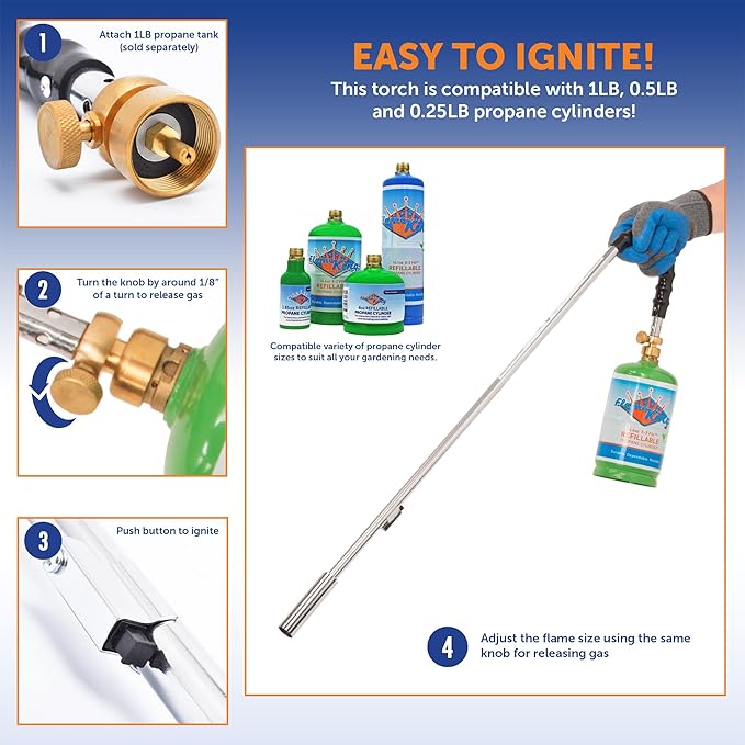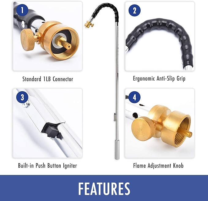 - Lightweight Torch produces up to 24,000 BTU, enough for burning weeds, melting ice, lighting BBQ and charcoal fire, and other outdoor uses