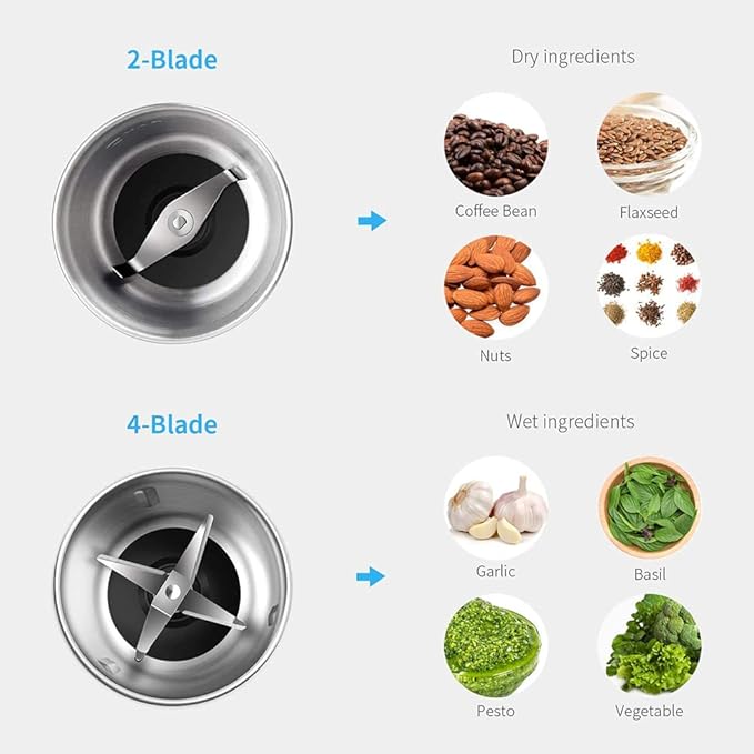 - Multi-functional Use To meet your various needs, our coffee grinder is equipped with 2 grinding cups. The 2-blade cup can be used for coffee beans, nuts, sesame seeds, flax seeds while 4-blade cup can be used for garlic, basil and spices.