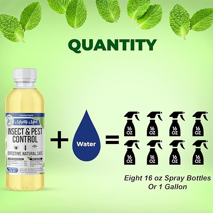 - 8 OZ CONCENTRATE MAKES MULTIPLE SPRAY BOTTLES – Ideal for long-term use and broad coverage, this 8 oz bottle of Mighty Mint concentrate mixes with water to create powerful peppermint insect repellent. Just dilute, shake, and spray for effective, natural pest control in your home, garden, or workspace.