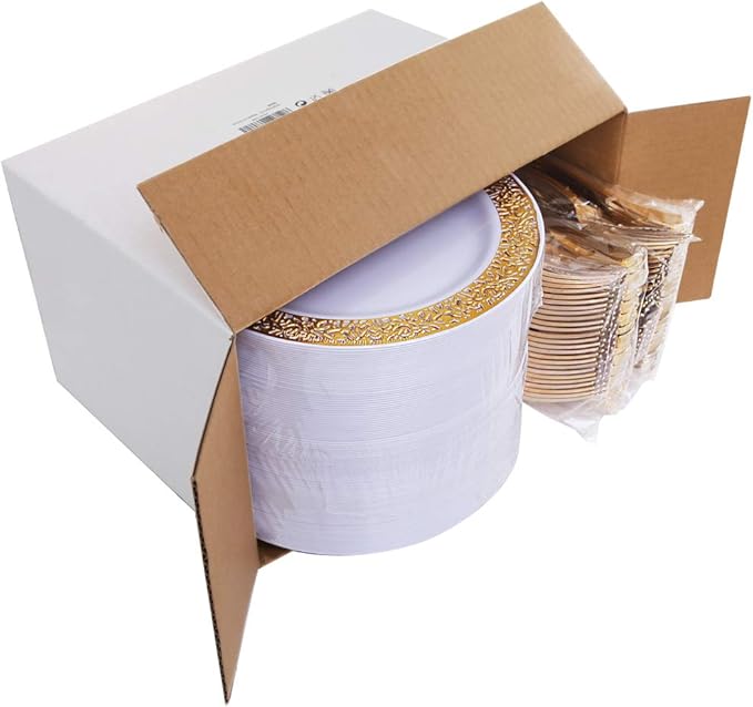 - SAFETY MATERIAL:Those gold plates and plastic forks are safe you and your guests. Solid, durable, heavy duty disposable plates ensure won't scratch or break easily.