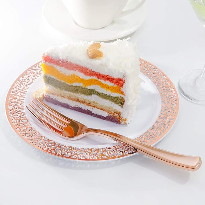 - BEAUTIFUL DESIGN: Elgant lace and modern design, our 100pack rose gold dessert forks are match well with 100pack rose gold plates. Your guests will amazing as they view the beautifully dinnerware set.