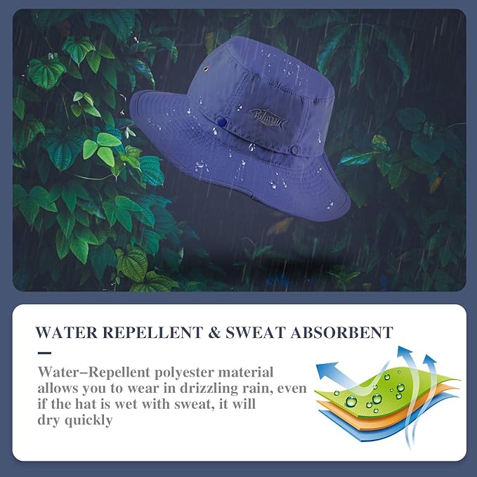 • Water Repellent: Nylon fabric with waterproof treatment allows you to wear in drizzling rain but may not be suitable for heavy rain. Sunproof factor does not wash off or wear off when hat is wet. The breathable fabric will always retain its sun protection and making it 100% suitable for fishermen, anglers, hunters, hikers, outdoor athletes