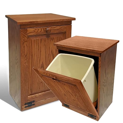 - QUALITY CRAFTSMANSHIP: This product is made of solid oak wood, and our tilt-out trash cabinet is strong, durable, and made to last. This cabinet's wooden waste basket holder is sturdy enough to hold your laundry or garbage. The strength of the top shelf will also let you place many books and other decoratives if you want.