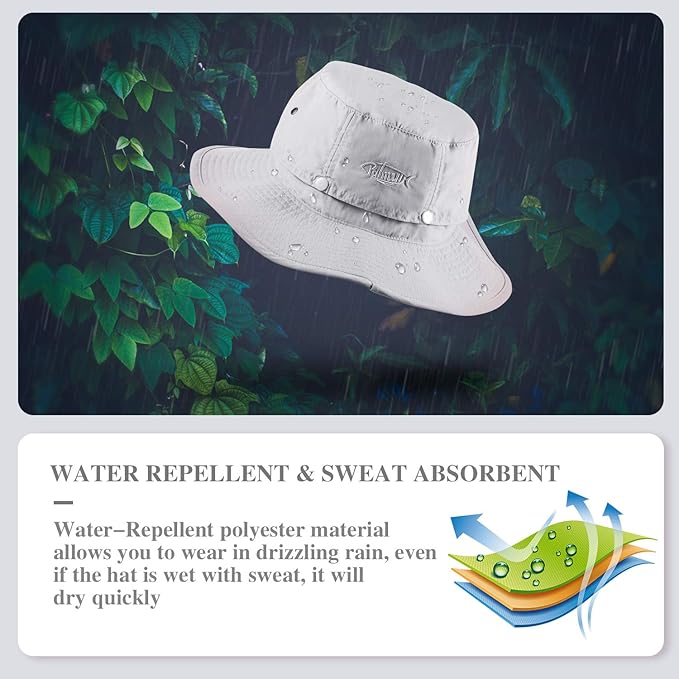 - Water Repellent: Nylon fabric with waterproof treatment allows you to wear in drizzling rain but may not be suitable for heavy rain. Sunproof factor does not wash off or wear off when hat is wet. The breathable fabric will always retain its sun protection and making it 100% suitable for fishermen, anglers, hunters, hikers, outdoor athletes