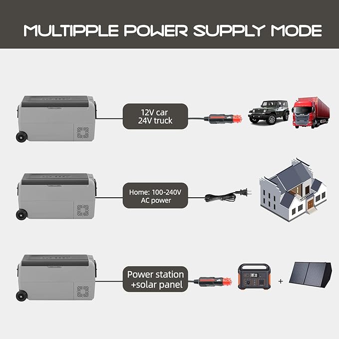 - ❄ CAR AND HOME USE:Includes 2 power cables to separately connect with 12/24V DC and 110V to 240V AC power inputs.Run great with your small solar system as well.