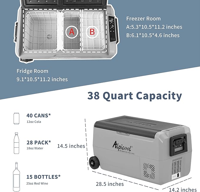 Alpicool T36 Dual Temperature Control 12 Volt Refrigerator 38 Quart Portable Car Fridge Freezer (-4°F~68°F) for Truck, RV, Boat, Camping and Travel