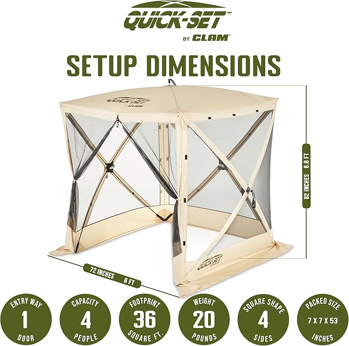 CLAM Traveler Pop-Up Screen Tent – 6x6 ft Portable Camping Gazebo Canopy, Tan – Instant Setup, Bug & Weather Protection, Lightweight Shelter for 4 People – Outdoor Events, Picnics, and Hiking
