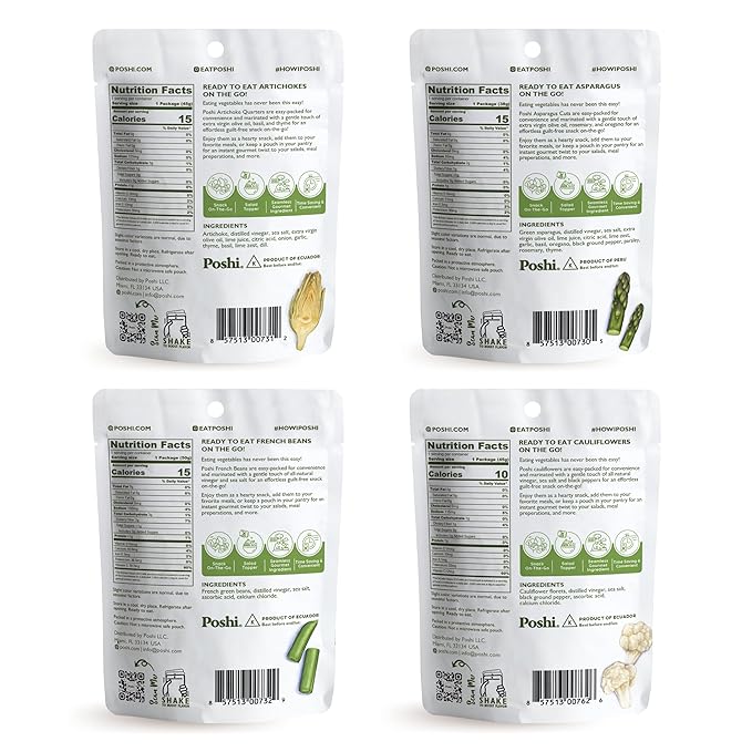 - HEALTHY SNACK SATISFACTION WHEREVER YOU GO: Poshi Marinated Vegetables are a tangy, delicious treat you can enjoy anywhere. They satisfy your savory snack craving without the junk. It’s real food made with simple ingredients & conveniently packaged so you’ll never have to reach for empty calories again.
