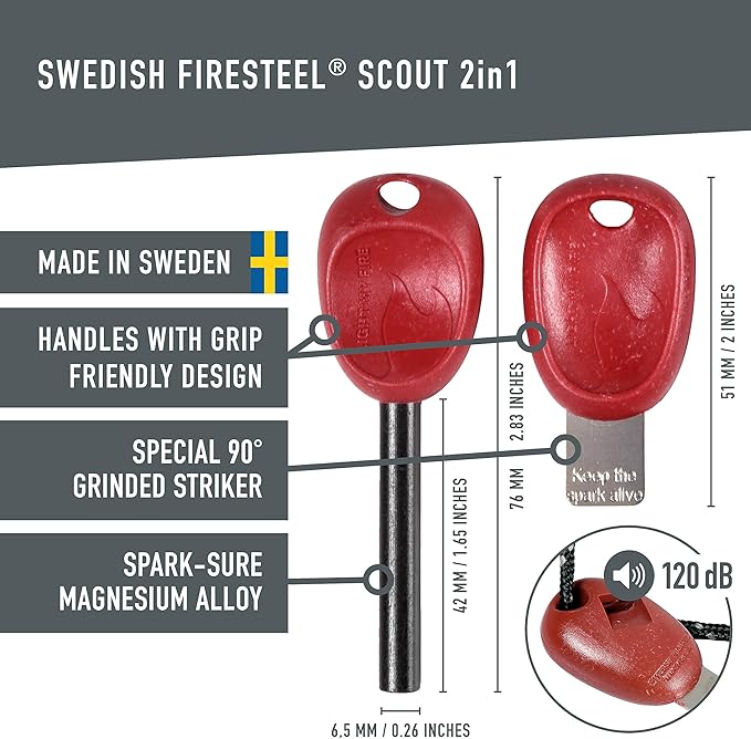 - BUILT-IN EMERGENCY WHISTLE INCLUDED with grip-friendly design, safe and so easy to use even a child can ignite the ferrocerium rod flint striker. Our enduring fire striker won’t let you down. Ideal outdoor emergency survival kit. Color: rockyred