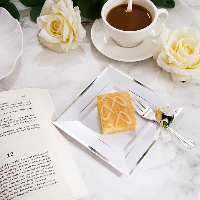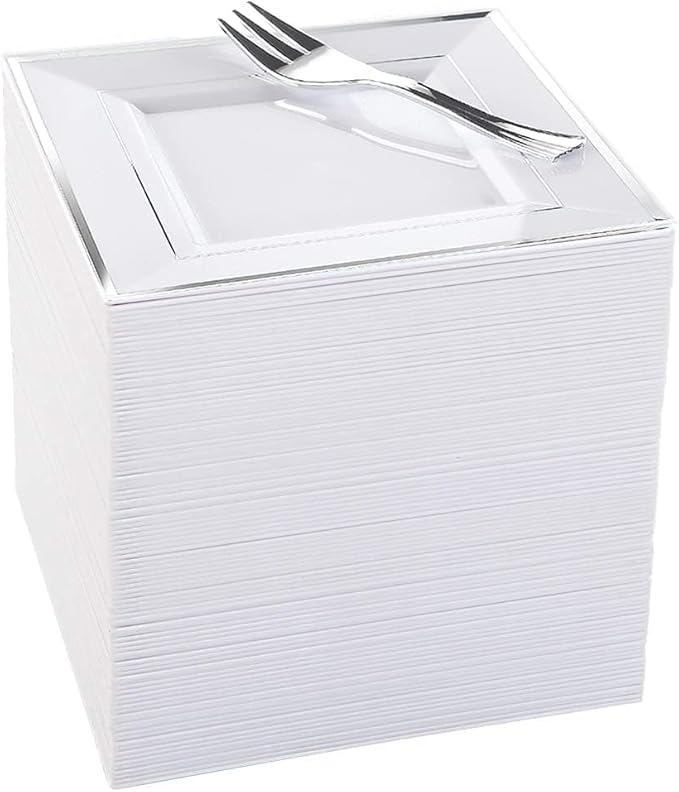 WDF Silver Plastic Dessert Plates with Plastic Forks - 6” 100 Square Disposable Appetizer Plates Small Plates Cake Plates with Silver Rim &100 Small Appetizer Forks for Party/Wedding.