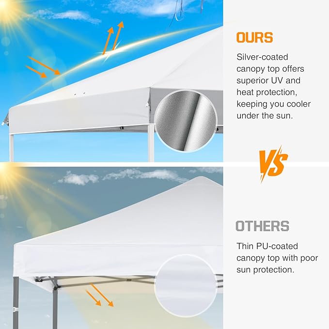 - PREMIUM STEEL FRAME WITH WEIGHT BAGS: Built to perform, the heavy duty canopy frame is made of high-grade, powder-coated steel and secured with hardened through-bolts for superior strength and rust resistance. Whether you’re using it as a canopy tent for events or a pop up tent for shade on the go, the included set of 4 weight bags helps anchor your setup for added stability in outdoor conditions