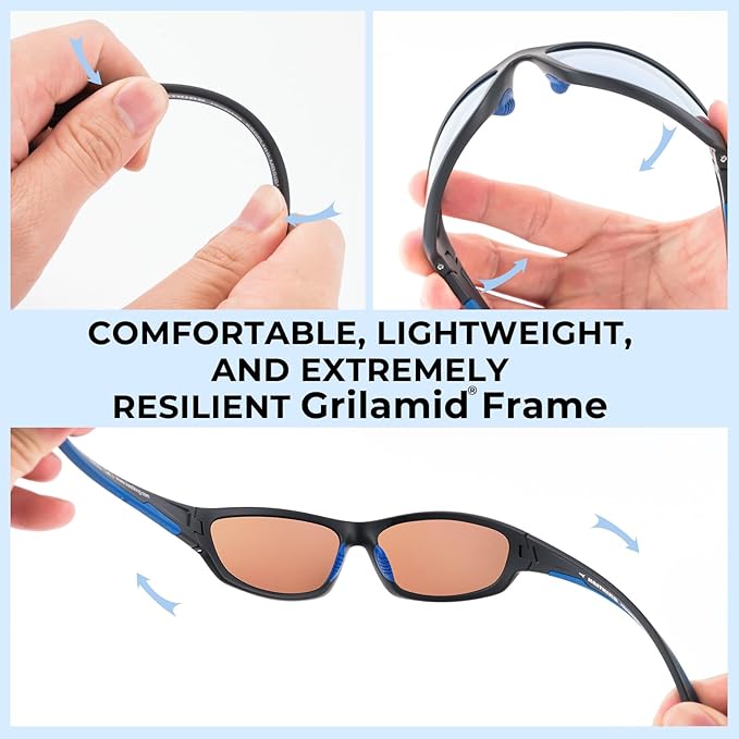 - KEY FEATURES - Polarized lenses reduce glare - Impact resistant TAC lenses protect your eyes from flying objects - Lightweight, durable, and comfortable Grilamid frames – Anti-slip nose and temple pads - Block 100% of the harmful UVA and UVB rays