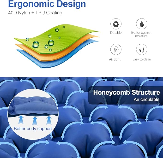 - 【Comfortable & Durable】Inflated size 195x65cm(77"x25.5"), with built-in pillow. Hundreds of the honeycomb air cells can distribute your body weight to provide better support,no limit for any sleep position. TPU coated nylon fabric makes the sleeping mat less noise but more durable, also buffer against hot or cold air from the ground.