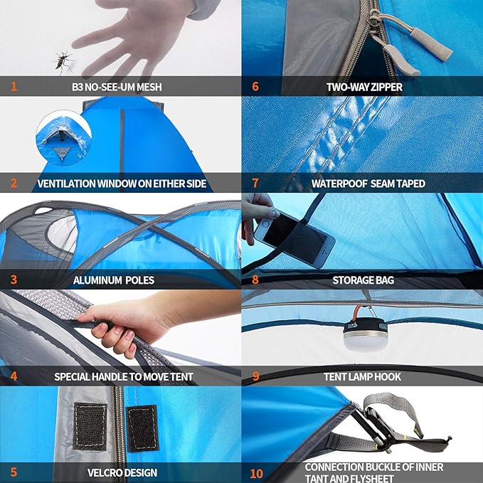 - 【Breathable & Stable】: Large section of mesh and 2 D-shaped doors with dual zippers provide much better ventilation. Equipped with 10 lightweight Alloy Pegs and 2 Wind ropes, the tent has a high resistance of wind.