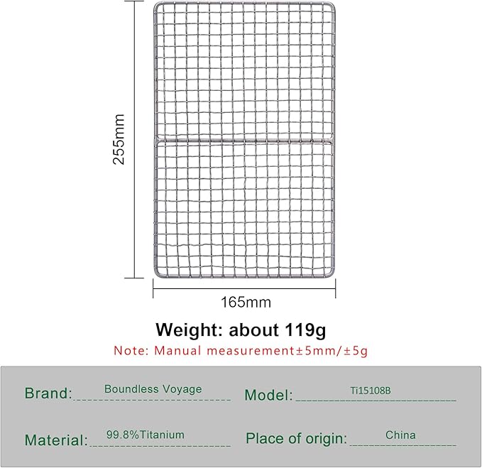 - 【LIGHTWEIGHT & PORTABLE】Camping BBQ Grill is mini size, the grill is 25.5cm*16.5, only 119g. This grill is specifically designed by experts for bushcraft and expedition camping. Engineered to fit into most backpacks. Small package is convenient to carry. It is a must have for any adventurer.