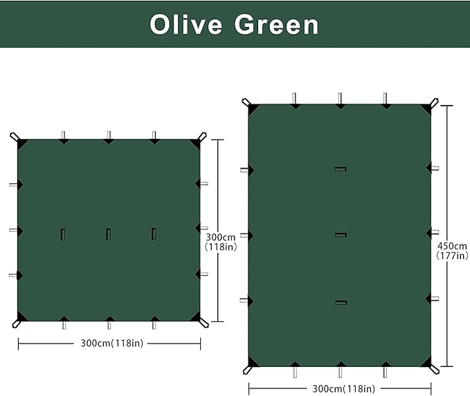 - LIGHTWEIGHT: Large camping tarp tent of 118inx118in/300cmx300cm but only weighs 1.8lbs/0.83kg. Includes 6 guy lines, 6 stakes and 1 carrying bag. Easy to keep in your backpack
