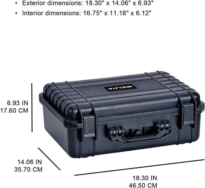 - ▶ Outside Dimension: Length 18.5inches Width 14.06Inches Height 6.93 inches.Inside Dimension:Length 16.75inches Width 11.18Inches Height 6.12inches.Cover Inner Depth:1.81inch.Bottom Inner Depth:4.31inch.Padlock Hole Diameter:0.31inch.Weight with foam:7.94 lbs (3.6 kg).The perfect compact size offers full protection for most mid-sized DSLR/mirrorless kits with lenses or serves as an excellent case for drones, audio gear, tools, or other valuables requiring serious protection.
