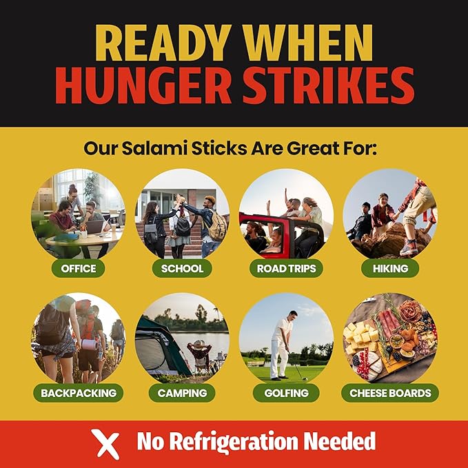 - The Ultimate Grab-and-Go Convenience: They're perfect for wherever life takes you - whether you're stuck in traffic, cheering from the sidelines, or need something to snack on at work. Our high protein pork and beef sticks don't need refrigeration, and unlike chips or crackers, they fill the hunger void.