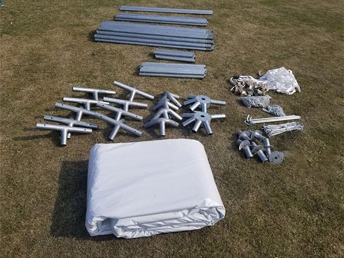- INCLUDES: The package includes a Blue/White Stripe PVC vinyl tent top, 1.5-inch steel frame tubing, steel pins, steel base plates and fittings that are resistant to rust and corrosion and a storage bag. Each piece of this inclusion is expertly designed and rigorously evaluated for durability