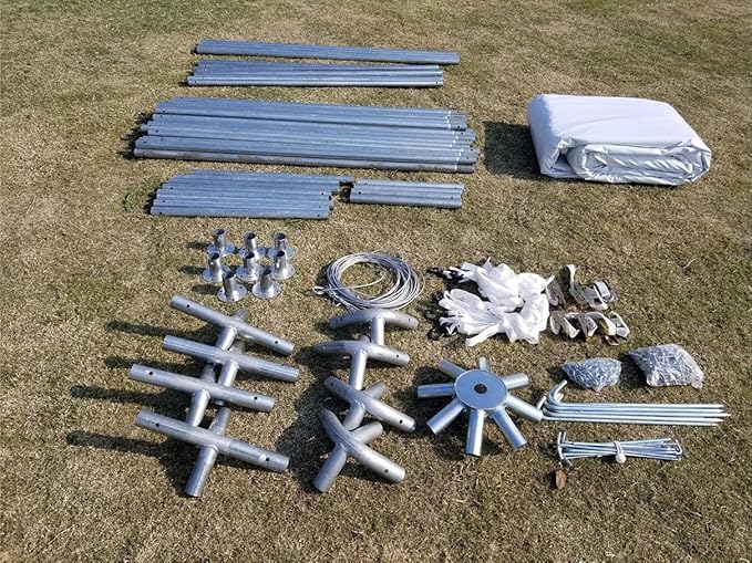 - INCLUDES: The package includes a Red/White Stripe PVC vinyl tent top, 1.5-inch steel frame tubing, steel pins, steel base plates and fittings that are resistant to rust and corrosion and a storage bag. Each piece of this inclusion is expertly designed and rigorously evaluated for durability