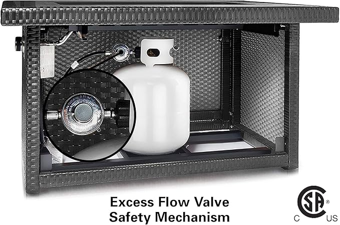 - ✓ SAFE & CSA APPROVED - stainless steel burner with highest safety standards is rated 50,000 BTU for terrific flame presence while the push button spark ignition system provides simple and convenient control when lighting. Chrome manual control valve allows 100% smoke free variable flame height. Easy and simple access to interior storage of standard 20-Lb propane tank (not included).