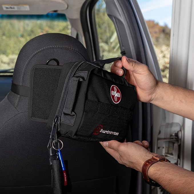 - MOLLE COMPATIBLE and PORTABLE: With a removable Velcro system, you can carry this survival first aid kit on your tactical backpack or adhere it to the material in your trunk. The Velcro is strong enough so you can carry this kit vertically without slipping. PLUS, this system comes with D-rings so it can attach to the roll bar on your ATV or truck.