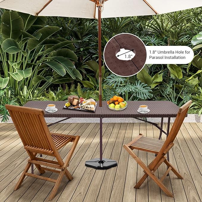 - 【Special Rattan Table Top with Umbrella Hole】Featuring gorgeous rattan pattern, the table top is 6ft long and 30inch wide, spacious enough for various activities. Meanwhile, waterproof and wear-resistant tabletop has a 1.8”umbrella hole, which makes it more practical for outdoors.