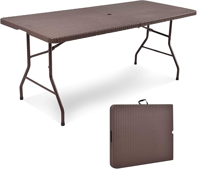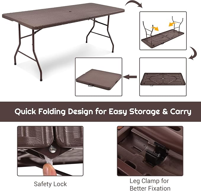 GYMAX 6FT Folding Table, Portable Lightweight Camping Table with Carry Handle, Easy Fold Up Rectangle Indoor/Outdoor Collapsible Table for Camp, Picnic, BBQ, Patio (Rattan Tabletop with Umbrella Hole)