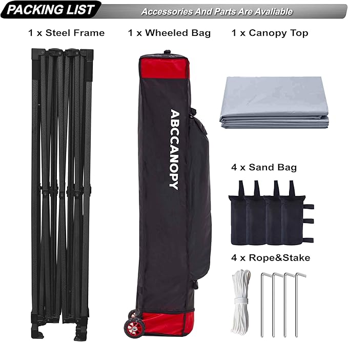 - Set up in second: Super easy to set up with only 2 people. Roller bag for easy portability and light transportation. Heavy duty wheels glide smooth. Bonus 4 Canopy Sand Bags, 4 Stakes &Ropes for stable and sturdy use.