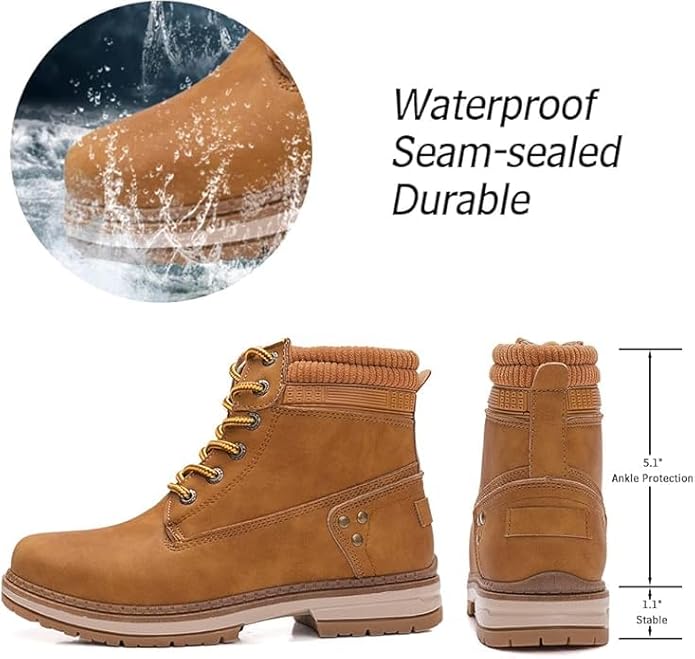 - Move easily from urban to wilderness, the lace up hiking boots improved with durable waterproof leather, comfy padded collar, and metal eyelet create an eye catching effect
