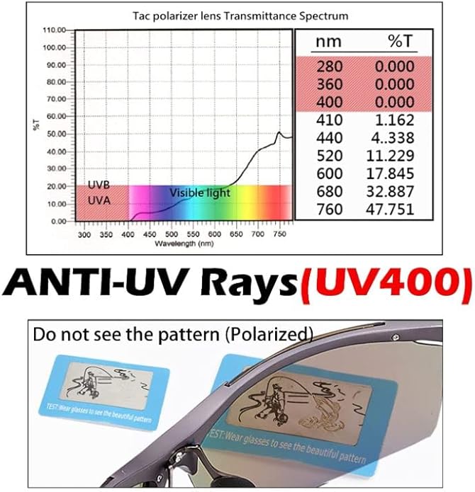 - ๐ PROTECT YOUR EYES PERFECTLY- Offer 100% Protective Coating Anti-UV RAYS (UV400) Protected from UVA / UVB / UVC and Harmful Blue Light up to 400mm - Protects from accelerated aging and Retinopathy. These Polarized Lens Shades can Block out UVA & UVB effectively which can filter out and eliminate Ultraviolet rays within the wavelength 400nm for Complete Eye Protection!