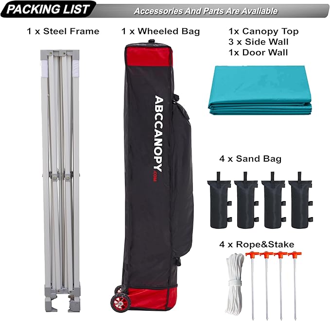 - WHAT IS INCLUDED - Commercial 10'x10' Pop Up Canopy Frame, 10'x10' Canopy Top Cover, 3 Removable Side Walls, 1 Door Wall. Roller Bag,4 Weight Bags, 4 stake and ropes.The upgraded style roller bag is more rugged and durable. One year after-sale protection for frame, six months after-sale protection for fabrics and accessories.