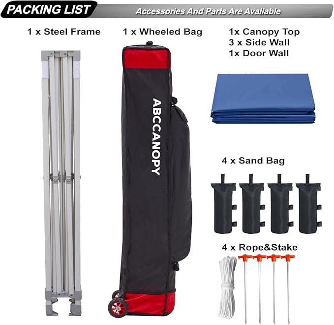 - WHAT IS INCLUDED - Commercial 10'x10' Pop Up Canopy Frame, 10'x10' Canopy Top Cover, 3 Removable Side Walls, 1 Door Wall. Roller Bag,4 Weight Bags, 4 stake and ropes.The upgraded style roller bag is more rugged and durable. One year after-sale protection for frame, six months after-sale protection for fabrics and accessories.