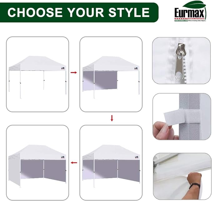 - Pop Up 10x15 canopy for party, parties, picnics, market stall/market trade show or any outdoor events.Eurmax commercial canopy tent suitable for both sunny and rainy days.1 year after-sale protection! Search "B075QK5XNC" to get the matched tent stakes.