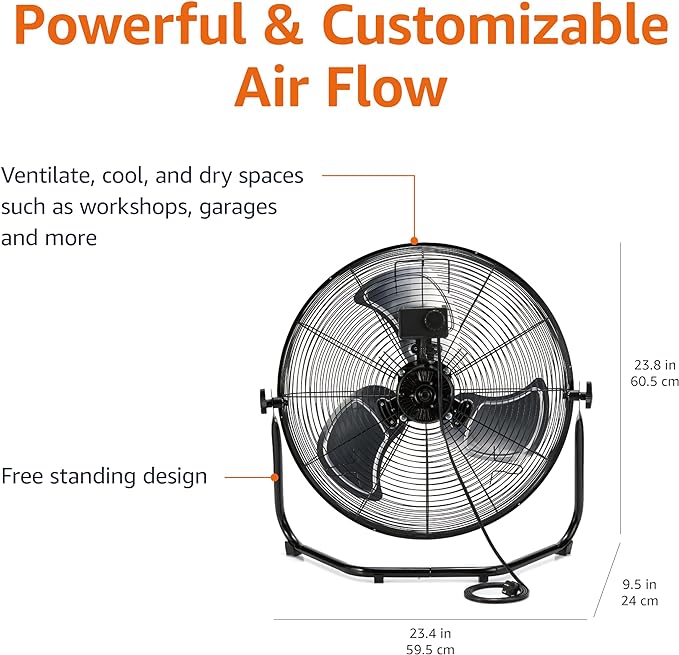 Amazon Basics 20" High Velocity Industrial Fan, Floor Fan, with 3 Speeds, Tilt Head, ETL-Listed Safety Compliance, Metal Housing/Blades, Ideal for Industrial/Commercial Space/Garage/Gym, 125W, Black