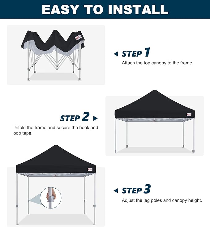 - ✅Simple and Rapid Setup: Set up in 1 minute in just 3 steps. 1.Take the fully assembled frame with top out of the bag and pull open. 2.Place the fabrics over the frame and extend the legs. 3.Use the thumb press buttons to easily adjust height and then snap into place. No tools required.