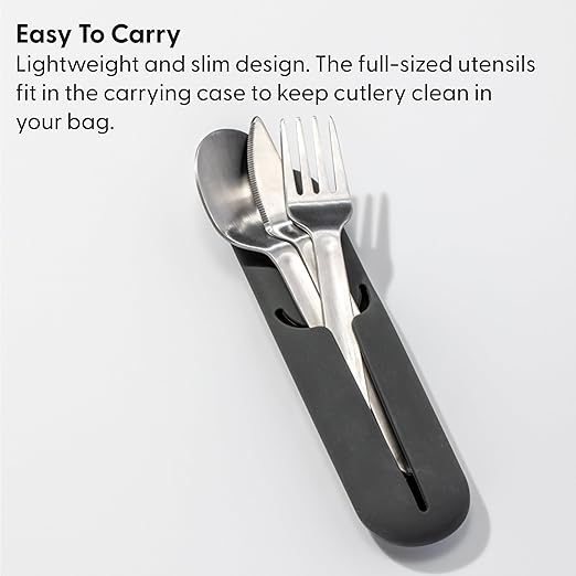 - EASY TO CARRY & CLEAN: Durable and lightweight, this compact flatware set is designed for daily use. The adult-sized utensils fit in the carrying case to keep cutlery clean in your bag; Each piece is dishwasher safe for quick and easy cleanup