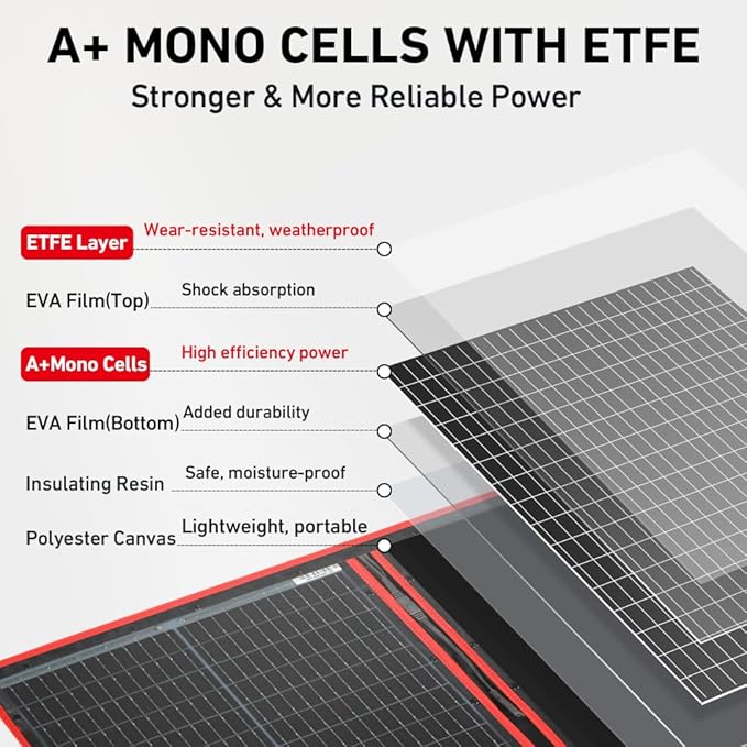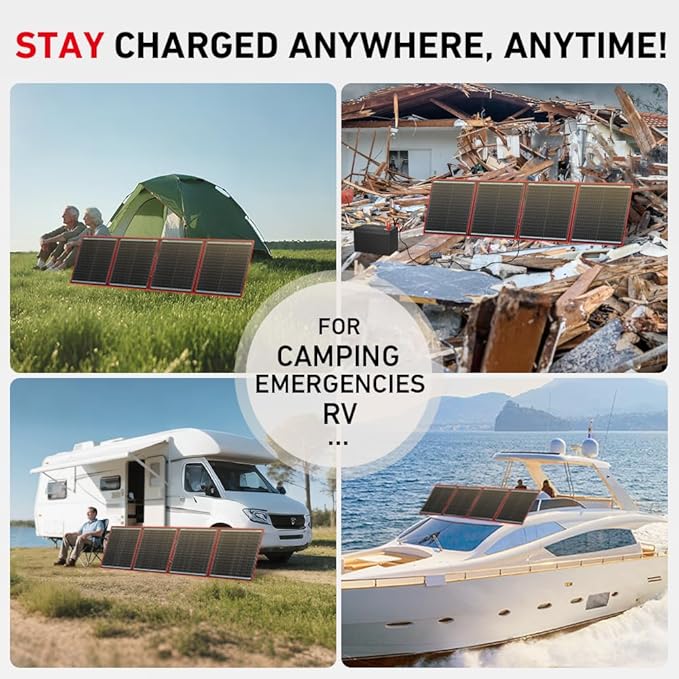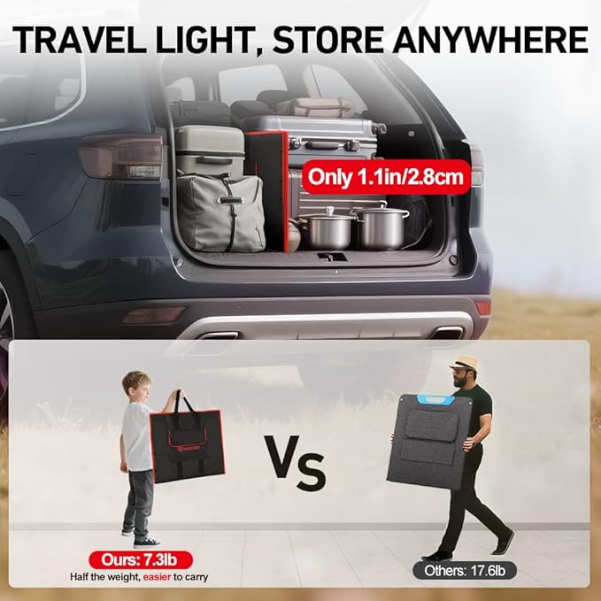 - 【COMPACT & TRAVEL-READY】 Folds down to 19.3x20.9x1.1in and just 7.3lb—light enough to pack, carry, and set up solo. Perfect for RVs, vans, camping, or backup power.