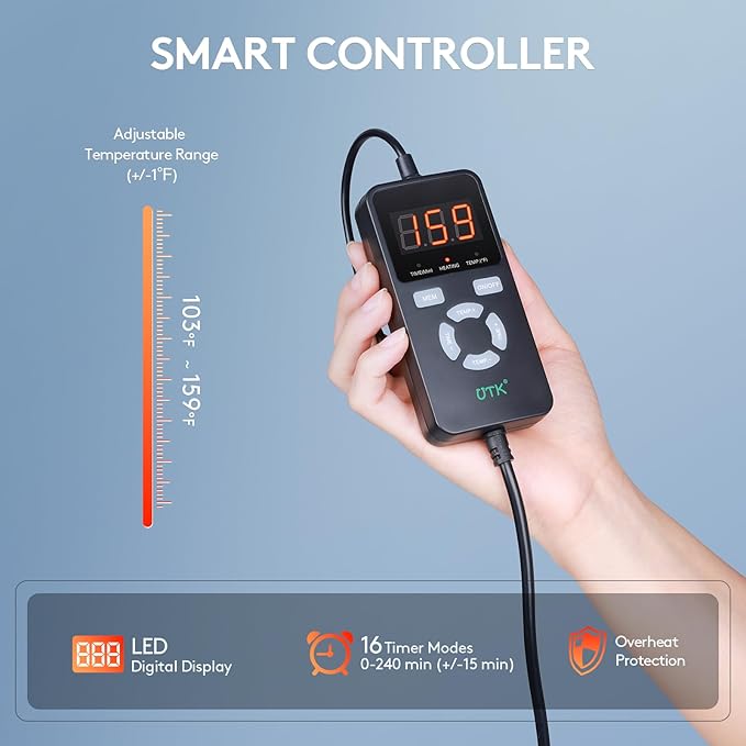 - EASY TO USE: This infrared heating pads equipped with an adjustable timer (15-minute increments, 0-240 min) and a precision temperature control system (103°F–159°F), this product delivers stronger heat than conventional options for enhanced effectiveness. With ±1°F accuracy, you can fine-tune your ideal comfort level. The intuitive LED interface ensures effortless operation for all ages, while the memory function eliminates repetitive adjustments—simply set it once for lasting relief. Perfect for seniors, it offers quick setup and sustained comfort