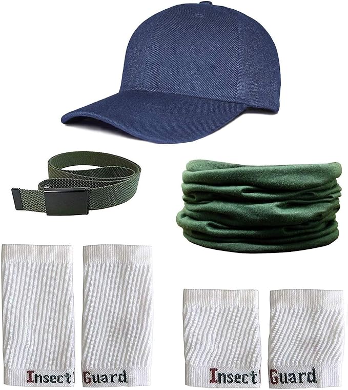 - One Size Fits All Up To Adult Medium. This package includes 1 Blue Hat, 1 Green Length Adjustable 54 Inch Fabric Belt, 1 Pair of White 7 Inch Long Leg Tick Gaiters, 1 Pair of White 4 Inch Long Tick Gaiters / Sleeve Cuffs and 1 Green Tube Bandanna. Registered to Repel MOSQUITOES, TICKS, FLIES & Other Insects that may Carry and Transmit Viruses and Diseases like the ZIKA VIRUS, WEST NILE VIRUS and LYME DISEASE. Great as - gifts for women, gifts for men, gifts for mom and stocking stuffers!