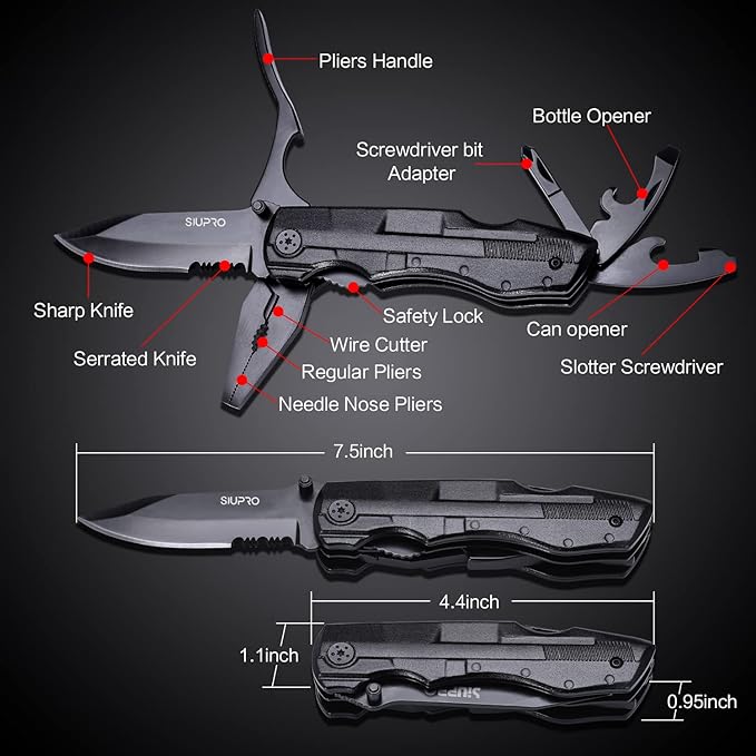 - 【All In One Tool】- Knife, pliers, can opener, bottle opener, and 9-in-1 screwdriver bit kit guarantees a multi-purpose using. It’s well built with stainless steel and coated with black oxidation. Perfect for hunting, fishing, travel, car, backpacking, hiking, outdoor activities, and work