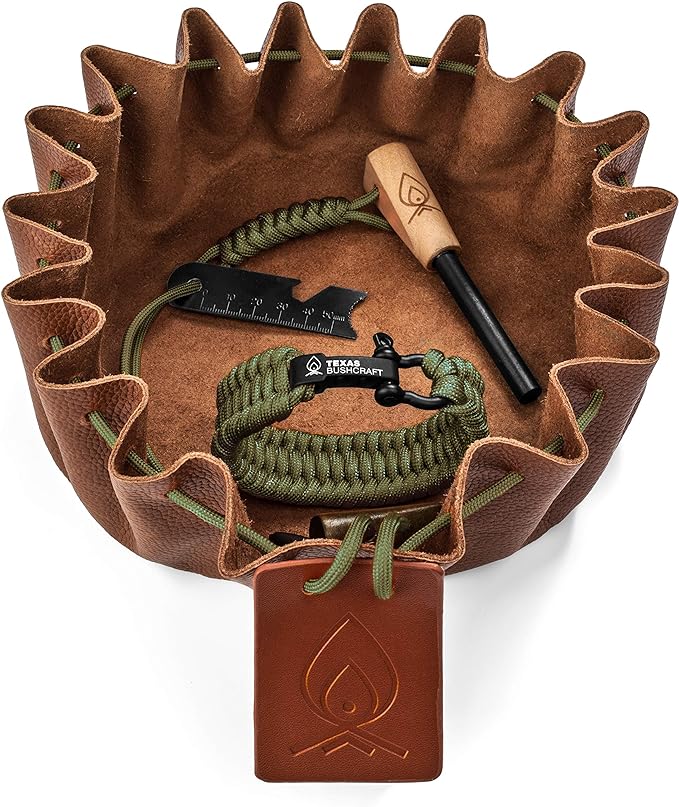 Texas Bushcraft Fire Starter Survival Kit - Ferro Rod Flint Fire Steel, Striker Tool | Cowhide Leather Tinder Bag | Emergency Paracord Bracelet Camping Gear