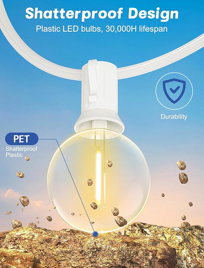 - Practical & Easy to Install: This outdoor decorative light string is very easy to install with a cable tie or cup hook, fix it or place it anywhere as you need. The G40 white patio string lights is very flexible and practical, a light bulb that goes out does not affect other lighting bulbs, Safe and durable electric string light either with an E12 socket base and a built-in spare fuse for easy replacement