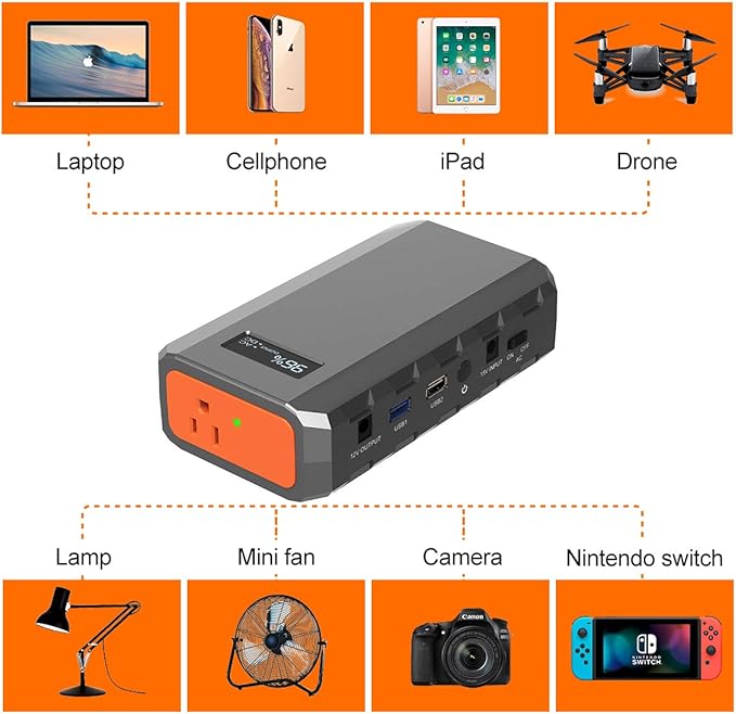 - 【Universal Charger】: Our product includes QC3.0 9v/2A and 5V/3A two USB outputs, one 110V AC outlet, one DC 9-12.6V/10A (Max) output, which means this charger can power your multiple devices at once. It can charge your iPhone and Galaxy up to 8 times, or 2 times for your 12'' Macbook