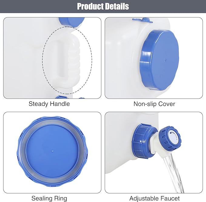- Worry-Free & Leakproof Spigot: Unique faucet design with different Silicon sealing rings and outlet position, easy to prevent leaking for carrying water, no fuss for water scattering everywhere. It is flexible to turn/off the spigot.