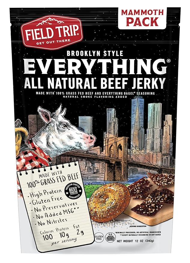 Field Trip Grass Fed Beef Jerky, Healthy Gluten Free Snacks, All Natural, Paleo-Friendly Meat Snacks, High Protein, Low Carb Snack with No Nitrates, 12oz Bag, Everything Bagel