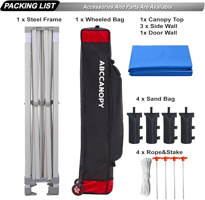 - WHAT IS INCLUDED - Commercial 10'x15' Pop Up Canopy Frame, 10'x15' Canopy Top Cover, 3 Removable Side Walls, 1 Door Wall. Roller Bag,4 Weight Bags, 4 stake and ropes.The upgraded style roller bag is more rugged and durable. One year after-sale protection for frame, six months after-sale protection for fabrics and accessories.
