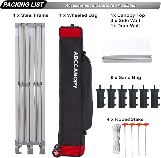 - WHAT IS INCLUDED - Commercial 10'x20' Pop Up Canopy Frame, 10'x20' Canopy Top Cover, 4 Removable Side Walls, 2 Door Wall. Roller Bag,6 Weight Bags, 4 stake and ropes.The upgraded style roller bag is more rugged and durable. One year after-sale protection for frame, six months after-sale protection for fabrics and accessories.