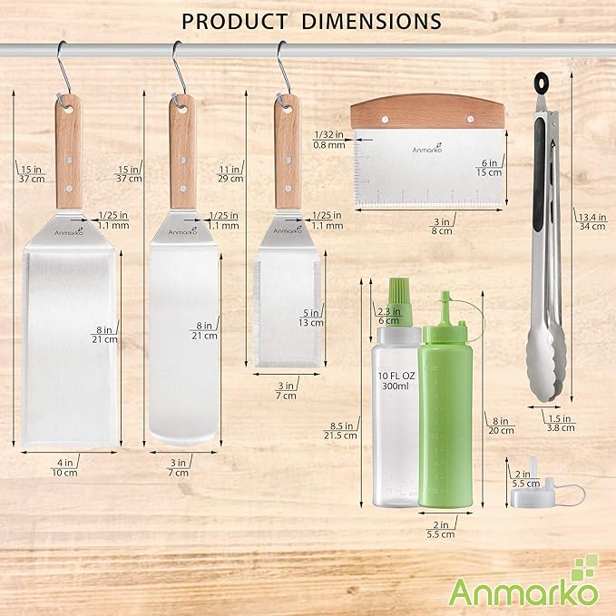 - Professional Stainless steel spatula set - includes 1 x cooking spatula turner, 1 x grill spatula, 1 x hamburger turner 4 x 8 inch, 1 x griddle scraper, 1 x grill tongs, 2 x squeeze bottles with silicone brush lid.